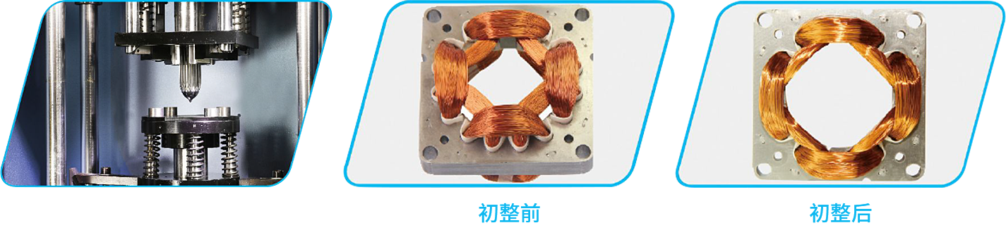 初整形模具:上模外腔收縮、下模內芯擴張、線圈上下端部高度可調(出線端向上),對于線圈端部高度壓縮較大的特殊定子線圈,其初整形模具還附帶確保線圈爬電距離的護齒機構;
